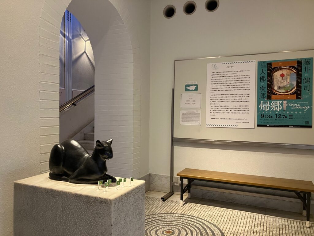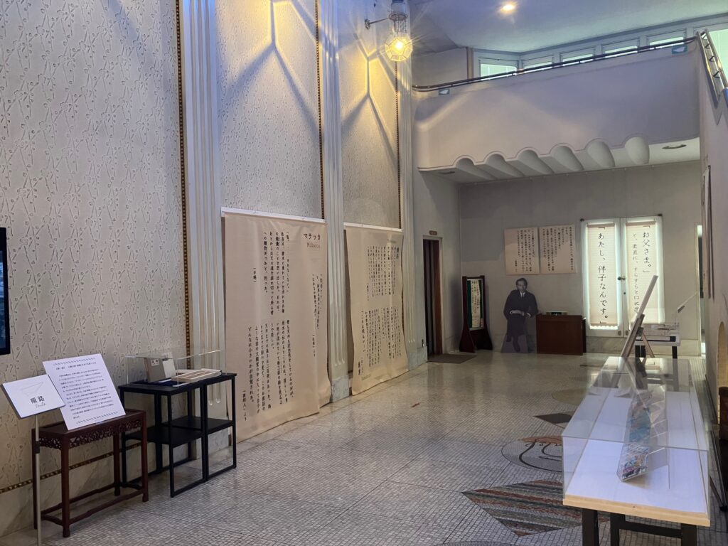 1階ロビーもテーマ展示の会場に!大佛次郎の小説「帰郷」の世界が広がります。右手は藤井健司≪絵手紙≫2006年(部分)。