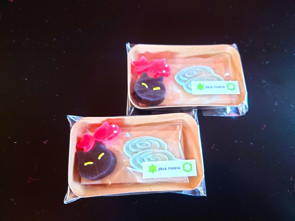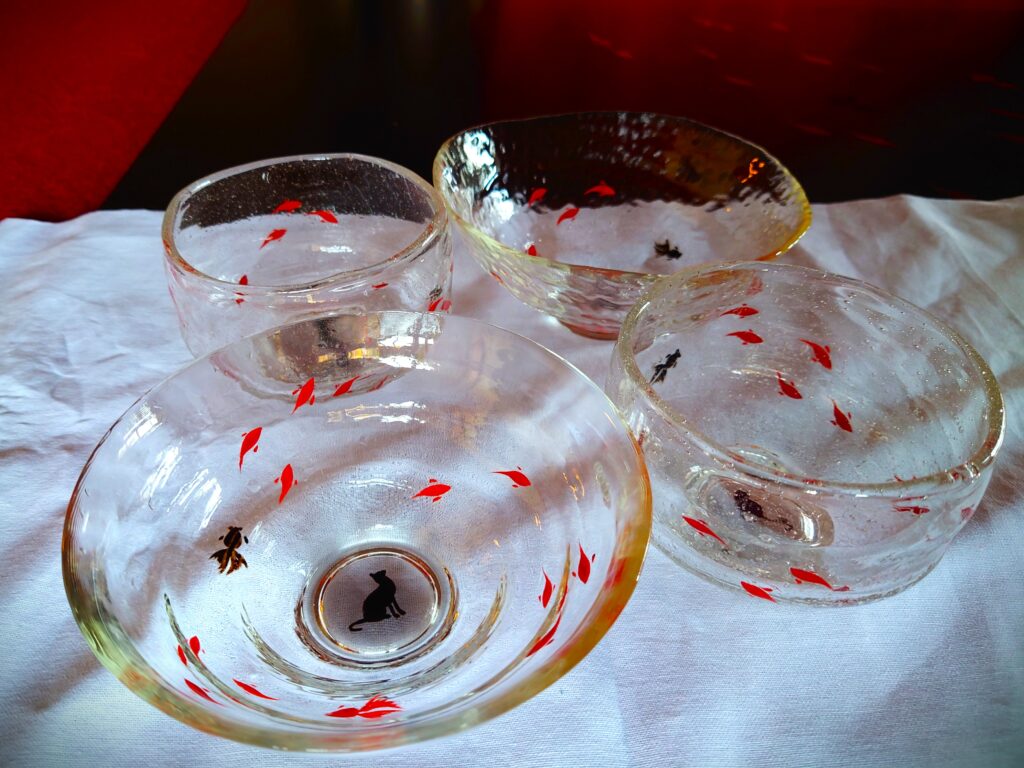 漆塗りの金魚が泳ぐ中と、お抹茶を飲み干すと猫が現れる可愛い仕掛けがされれています。