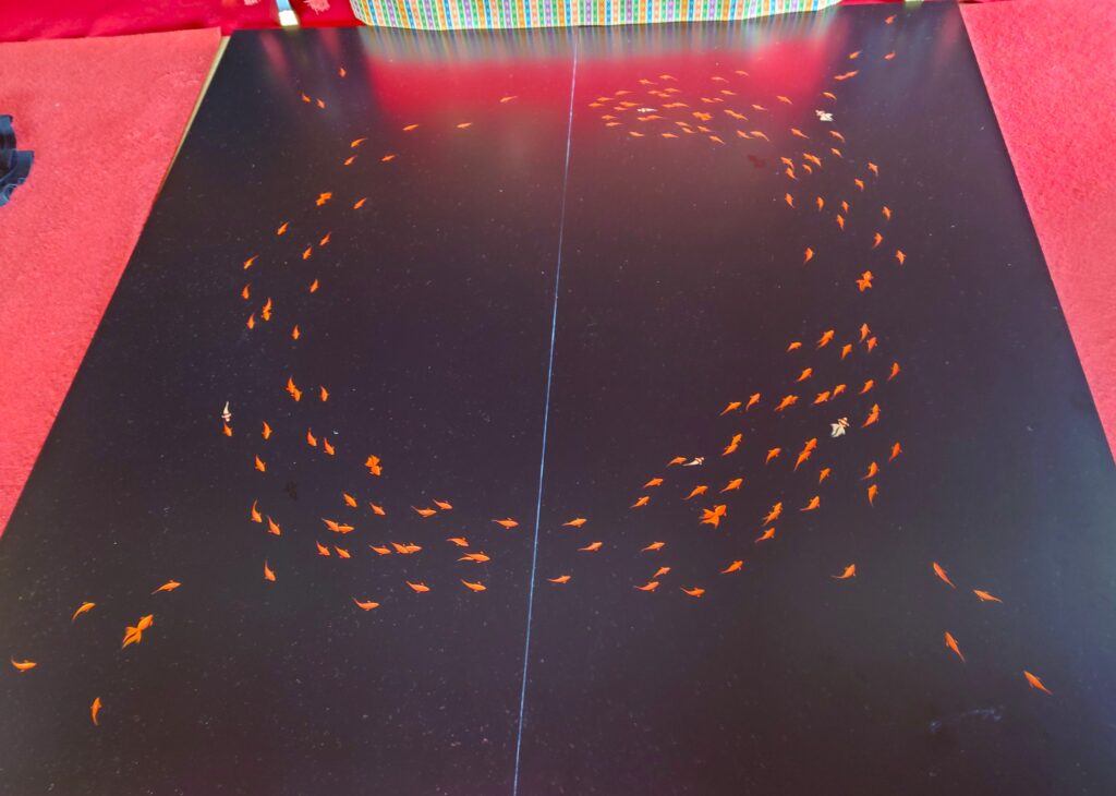 七段飾りのお雛様の前には、この茶会の為に作られた漆で回遊する金魚たちが描かれた漆パネルが置かれています。